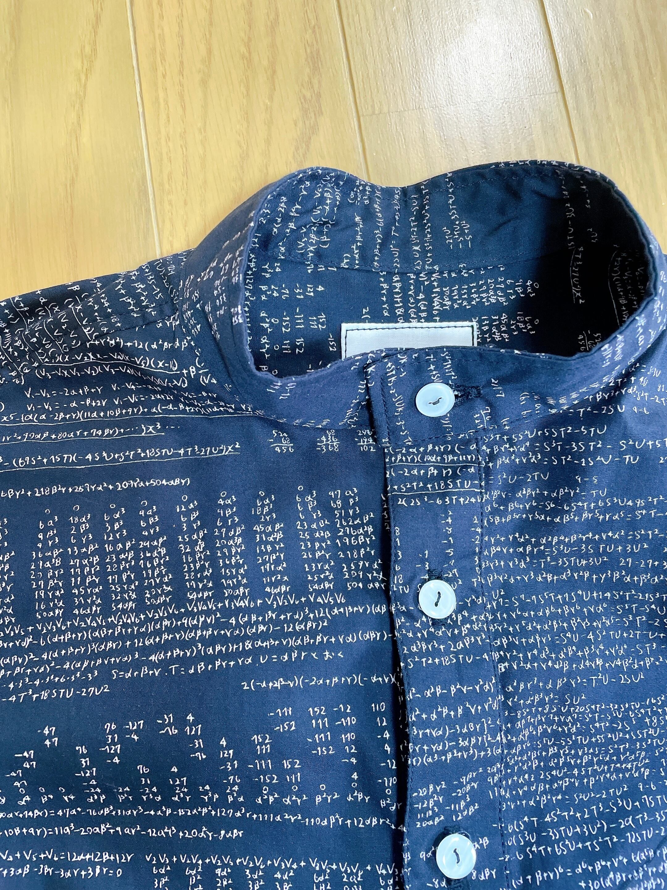 襟はスタンドカラーで、前合わせは胸の途中までがボタンで開くデザインです。かぶりで着用いただきます。